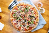 Pepperoni, sausage, ground beef, mushrooms, onions, green peppers, black olives and red sauce and cheese.